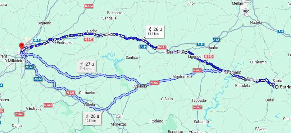 Voor wie de Camino de Santiago wil lopen maar beperkte tijd heeft, is de route van Sarria naar Santiago de Compostela de meest efficiënte keuze. Deze trajecten voldoen aan de minimale afstand van 100 kilometer die vereist is om de officiële pelgrims­oorkonde (Compostela) te verkrijgen.